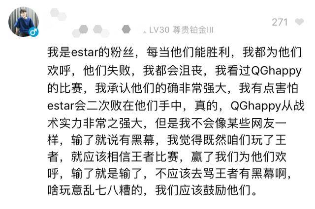 这位名为“雷锋”的网友留言道:“作为eStar的粉丝,承认QGhappy非常强大,但不会像某些网友一样输了就吐嘈比赛有黑幕,既然玩了王者就应该相信王者,赢了就是赢了,输了就是输了,应该多鼓励他们。”