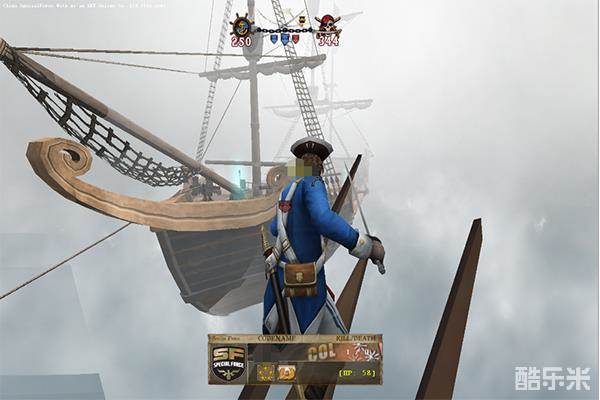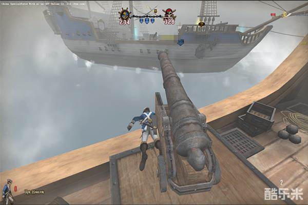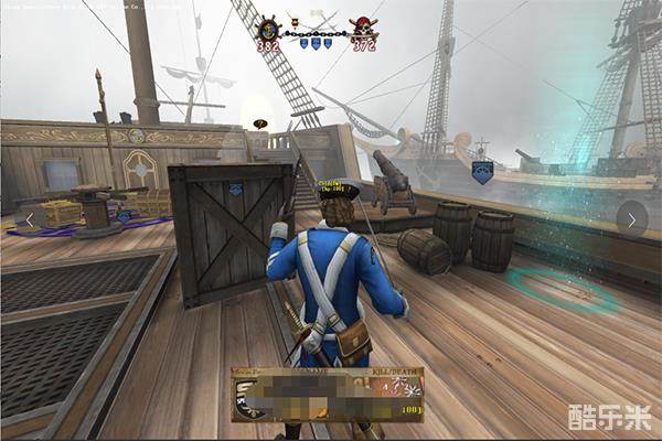 进入游戏里面首先你将看到浓厚的大航海时代的背景元素,游戏内设置有三艘木质的的战舰,战舰尾端使用钢索相连,玩家可以通过绳索去到对面的战舰上,也可由蓝色光圈跳到对面战舰进行近距离拼杀。