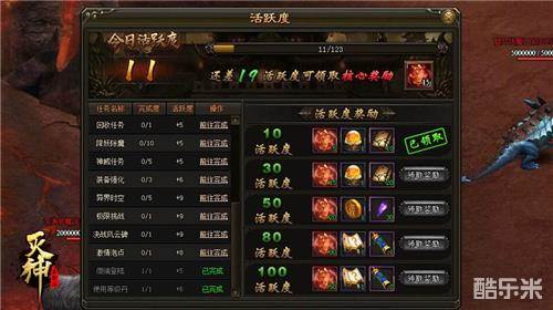 活跃度是衡量玩家在游戏中活跃程度的基本,完成每日签到、击杀野怪、强化装备等任务越多,活跃度就越高,可以领取的奖励也就越多。累计10活跃度就可以领取5枚等级碎片,将它们累积到一定程度,就可以在等级丹中进行合成,角色服用后即可大幅提升等级经验。除此之外,玩家还可领取到神秘积分卷轴,会有意想不到的收获哦!