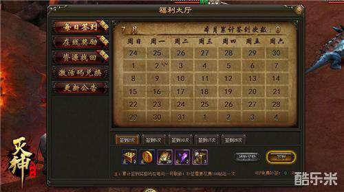福利大厅,看名字就知道必然是领取福利的宝地啊!在《灭神》中,福利大厅包含每日签到、在线奖励、资源找回、激活码兑换、更新公告五个部分。