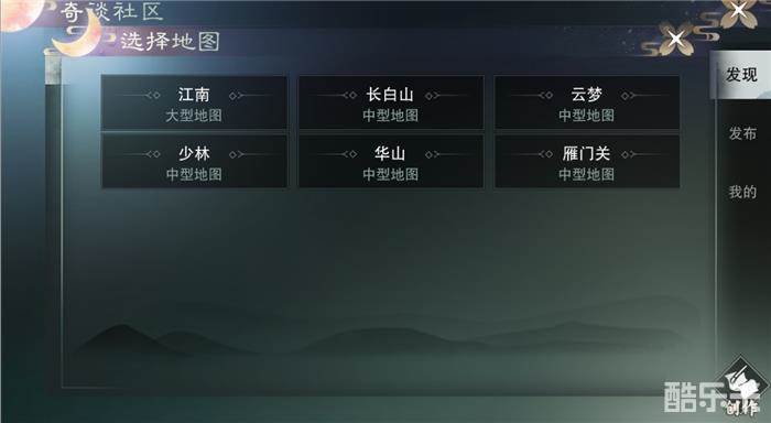 从游戏主界面打开“奇谈”,点击右下角的创作按钮,即可进入奇谈编辑-地图选择界面。选择一张地图作为剧情发生的地点。