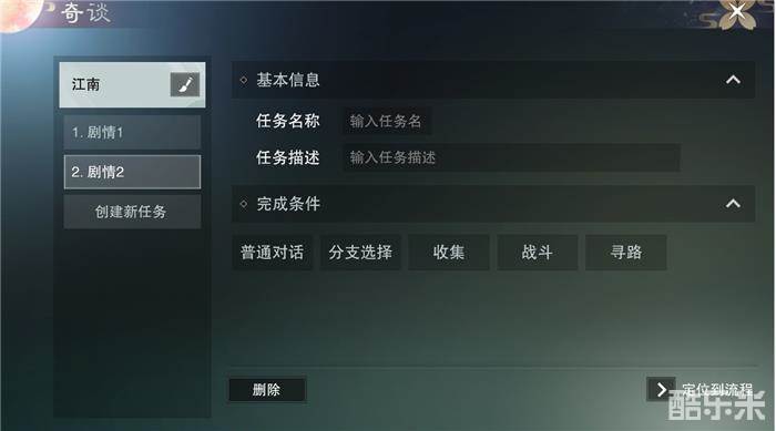 在任务列表中选中一环任务,会切换到对应任务的信息编辑界面。由基本信息和完成条件两部分组成。基本信息包括任务名称和任务描述;每一环任务都需要设置一个完成条件,目前共开放普通对话、分支选择、收集、战斗、寻路五类完成条件可供设置。