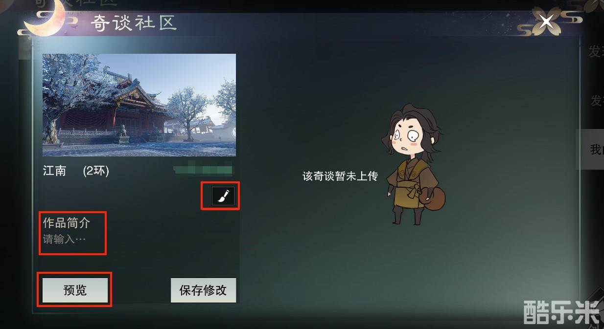保存完毕的奇谈,会进入“奇谈社区”-“我的”分页中。设置好奇谈的标签和简介,就可以点击作品上方的发布按钮,发布到社区了;所有玩家都可以在奇谈社区中可以接取其他玩家制作的奇谈任务,并进行评论和点赞。