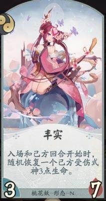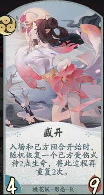 | 入场和己方回合开始时,随机回复一个己方受伤式神3点生命,造成3点伤害,增加7点生命 | 入场和己方回合开始时,随机回复一个己方受伤式神2点生命,将此过程再重复2次,造成4点伤害,获得9点生命 | 复活一个己方式神并使其在本回合获得迅捷 |