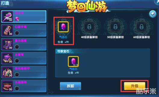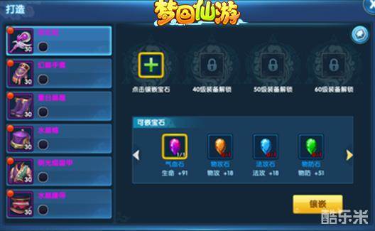 在《梦回仙游》里,装备等级是快速提升战力的一个途径,当然仅仅提升装备等级也是远远不够的。宝石的镶嵌也是一个提高战力的好方法。选择自己适合的宝石进行镶嵌,可以对以后的任务等会轻松很多哦。三十级的装备能嵌套一个宝石,四十级两个,五十级三个。六十级四个,装备最高能镶嵌四个宝石。
