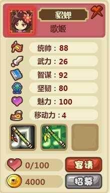 三国战将貂蝉/荀?属性图解,貂蝉/荀?招募花费是多少?话说貂蝉一直是被玩家们娓娓道来的。貂蝉/荀?属性是不是给力呢?