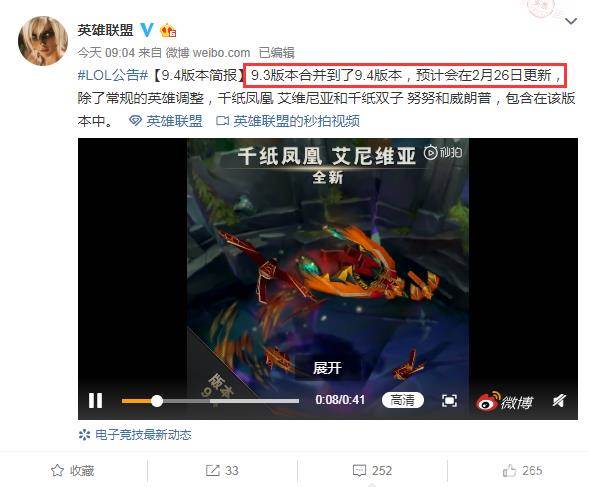 英雄联盟官微发布公告,9.3版本合并到了9.4版本,预计会在2月26日更新。