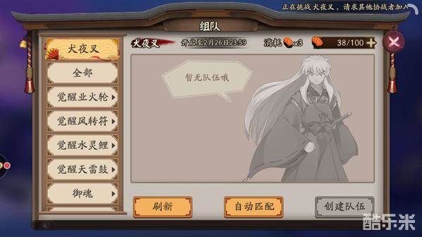 3、点击庭院的左下角的“组队”选项,就可以在最上面看到犬夜叉联动妖气副本,然后排队进行参加。或者通过探索中的御魂、觉醒材料中的“组队”也是可以的。