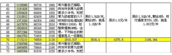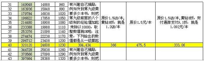 计算公式:你目前的种族熟悉度等级数值开始计算,一直累积叠加到配方需要的种族熟悉度等级减去一个等级的数值 ,然后前面的加的总和,除以1万熟悉度值(因为一本书是加一万该属性熟悉度的),然后取最后的算出来的整数值就好了,需要多少钱。就按照上述说的算,原价1.5QB/本,黄钻8折,就是1.2QB/本 ,财付通微支付9.1折,就是1.092元/本 ,推荐用微支付,但是有优点,也是优缺点的,微支付就是每次额度有上限,这个是缺点。