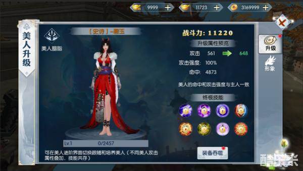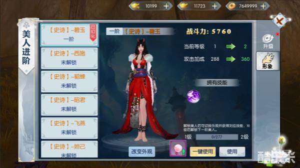 美人进阶可以解锁外观形象和专属技能,还可提升美人的自身属性。