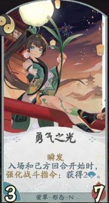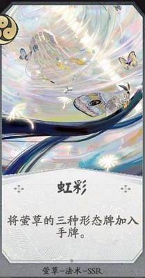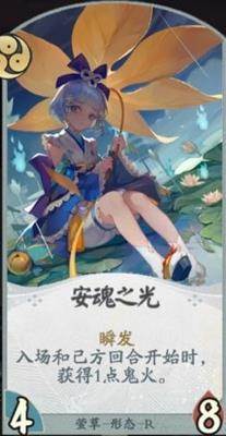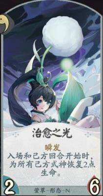 | 瞬发,入场和己方回合开始,获得1点鬼火 | 本回合中,敌方战斗区的式神伤害为0 | 将莹草的三种形态牌加入手牌 |