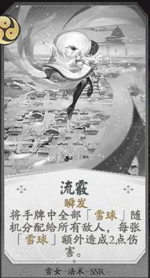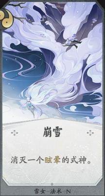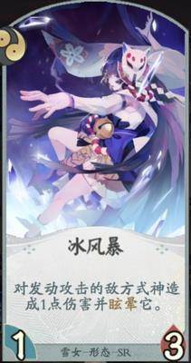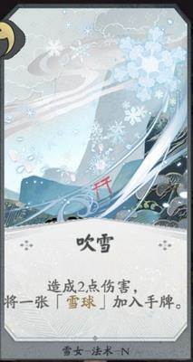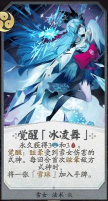 | 对发动攻击的敌方式神造成1点伤害并眩晕它 | 永久获得3点伤害和3点生命 觉醒:眩晕收到雪女伤害的式神。每回合首次眩晕敌方式神时,将一张雪球加入手牌 | 瞬发,将手牌中全部雪球随机分配给所有敌人,每张雪球额外造成2点伤害 |