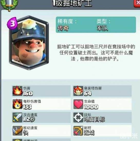 卡牌解析:掘地矿工在6阶竞技场解锁,圣水消耗为3点,(话说这货长得很眼熟,飞屋环游记里跑出来的?),卡牌非常灵活,可玩性高,出场方式也很特别,从地下冒出来。比较针对公主和采集器。
