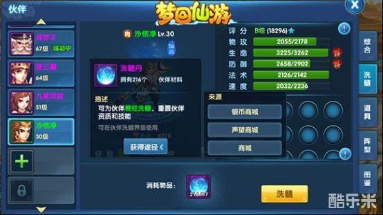 当你选好要培养的伙伴时,首先需要洗髓(神将除外),洗髓主要洗的便是伙伴的品质和技能的数量。洗至神品,即使颜色是绿色的都没关系。资质是可以通过用伙伴资质丹(市场购买)来增加,累积到一定程度伙伴便会自动换颜色的。