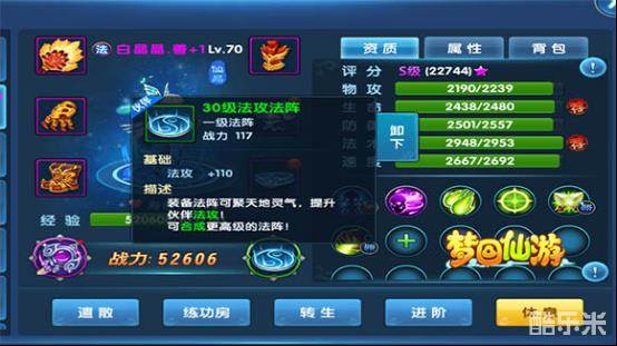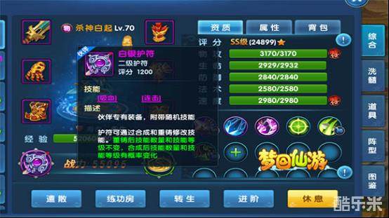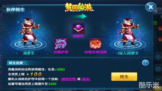 伙伴达到65级后可以开启转生系统,转生可以吞噬置入的法阵属性和护符中的随机一个技能,并且全资质上限+100,仙露可增加资质上限提升至3350。不同品质的伙伴转生需要回梦丹或者超级回梦丹,可通过市场购买得到。
