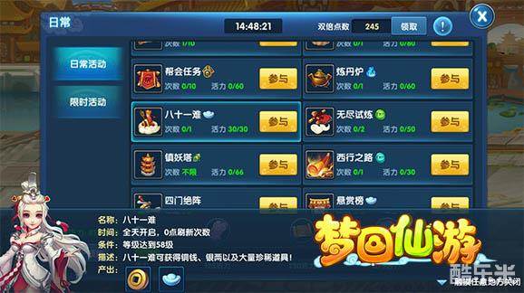 人物等级达到58级后可参与,可在长安城羽林卫中接取。可产出大量铜钱、银两以及大量珍稀道具。