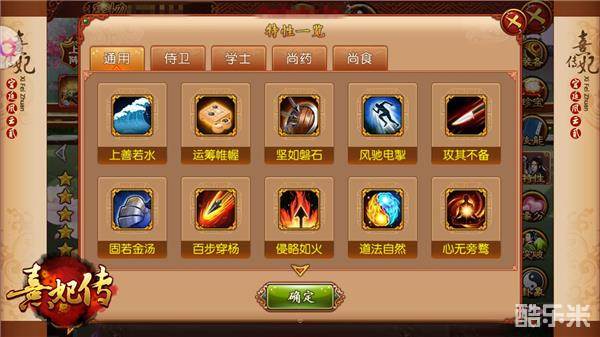 特性类似于技能与天赋,能在战场上给出增益等宫斗效果,唯有资质较高的随从身上才能显出这份得天独厚。在《熹妃传》当前版本中,初始品质为橙色的随从在突破等级达到15级可开启通用特性,突破等级达到20级可开启职业特性。随从们开启特性栏后,可在众多不同特性中选取合适特性进行修炼进阶,每次想要修改特性重新选择时,均要消耗一张特性券。有了入门券,小主们接下来就要真正开始漫长的特性进阶之路。