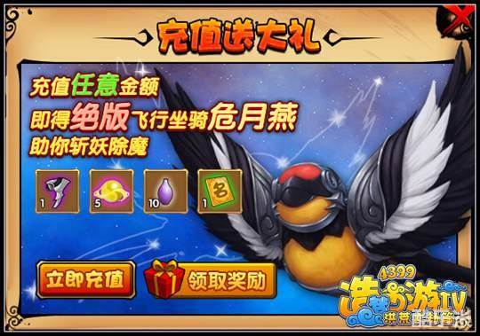 造梦西游4绝版飞行坐骑危月燕登场,只要你充值任意金额,就可以领取这一只坐骑(可以进行飞行)。接下来赶紧来看看吧。