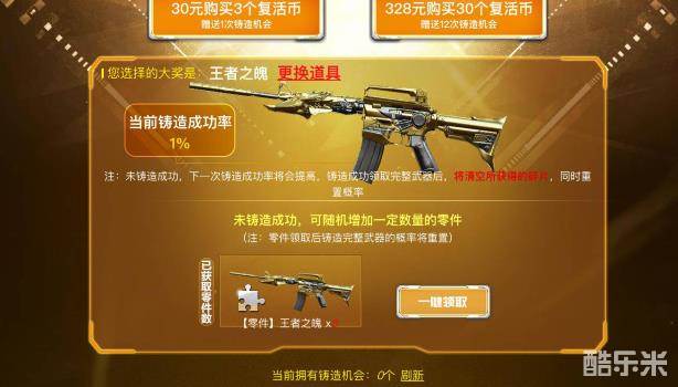 在页面花费30元购买3个复活币可以获赠1次铸造机会,花费328元购买30个复活币可以获赠12次铸造机会,每次铸造武器会消耗一次铸造机会;