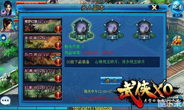 除了神兵外,角色到达30级后还能组队进入副本刷装备。玩家可以邀请两位游戏中的好友一起组队进入副本,3人组队的话通关很轻松就能获得装备。不同难度的副本掉落不同品质的装备,通过深渊级别的副本可以得到30级的上品装备。这里告诉大家一个小秘诀,每天12:30-13:00这半个时间内,副本掉率双倍,无疑是下副本刷装备的最好时机,可千万不要错过哦!