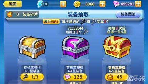 游戏的装备系统必须是玩家的系统等级达到3级才可以哦,玩家得多多玩主线任务就可以了。然后就来介绍下各等级装备的获取吧。1-3星装备玩家可以使用铜钥匙抽取,但是随机掉落哦,有第一定的几率,若是钥匙就得用30钻石来开启箱子。3-4星装备使用银钥匙,要不就是花费128钻石开启,4-5星使用装备碎片开启,45个碎片才能开启一次,连开10次必得一件5星装备哦。