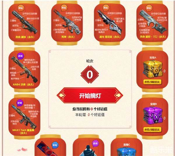 2. 消耗好运值进行摘灯,每次摘灯必得11个奖励中的一个(已抽到的奖励将被剔除并不会再被抽到)。其中有3个为宝箱,可自由选择其中的道具;