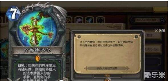 法术猎在近期能够崛起的一个重要原因,就是因为这张法术弓的出现。7费4/2,从攻击属性上来说非常一般,但是考虑到他的战吼效果,能将许多的法术牌加入到自己的手牌中,这样来看这把武器就非常优质了。当然最好你要祈祷一下,因为给予你的法术牌是随机的,所以,假如你在没有亡语随从的情况下,却送给了你一张装死,这不就是非常尴尬的事情了么。