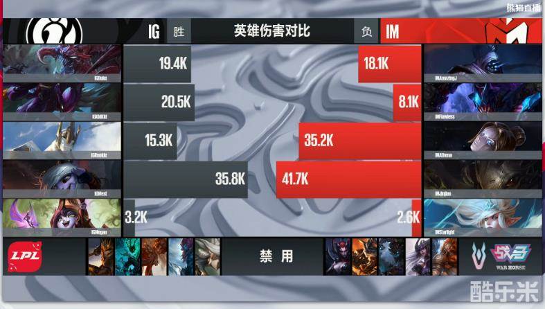 双方均是选择了比较偏后期的阵容,相比于IG的团战阵容,IM是有着武器大师单带的优势。比赛开始,双方打野均是上半部野区开,在比赛前期,IG通过第一波的野辅野区入侵取得优势,利用小炮的快熟推塔,IG很快便将经济领先扩大。比赛进入转线期,IM紧缩防守,很好的守住了IG的推进节奏,并没有让IG找到机会更进一步扩大领先,并且己方贾克斯已经开始顺利发育起来了。但是,随着25分钟,IG加里奥的一波终极绕后,抓到了IM打野,随即IG选择开大龙,IM被迫逼团,碍于正面战斗力的差距,IM被击杀四人,IG一举扩大领成功拿到胜势。之后的比赛再次进入IG节奏,IG也是完全没有给IM任何的机会,稳稳的破掉IM三路高地后,IG成功拿下了首局比赛的胜利!