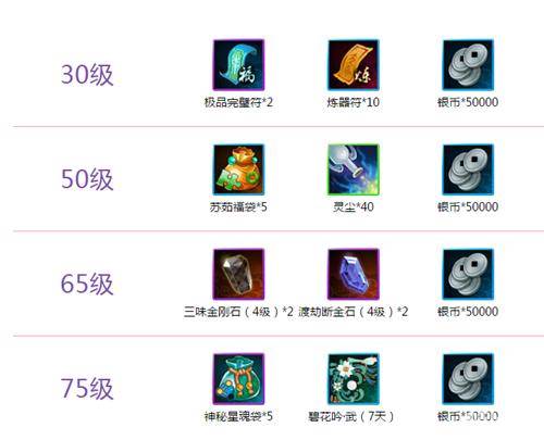 首先到达30、50、65、75级的前100名玩家可以获得丰厚奖励;