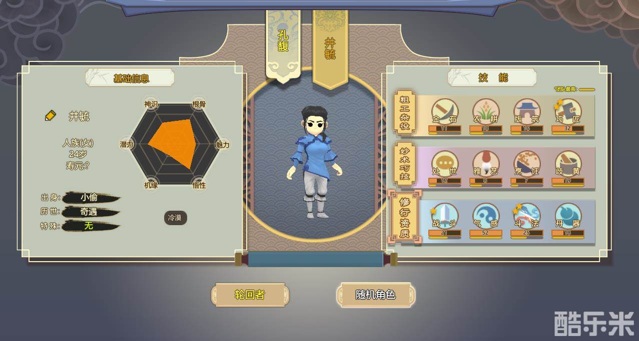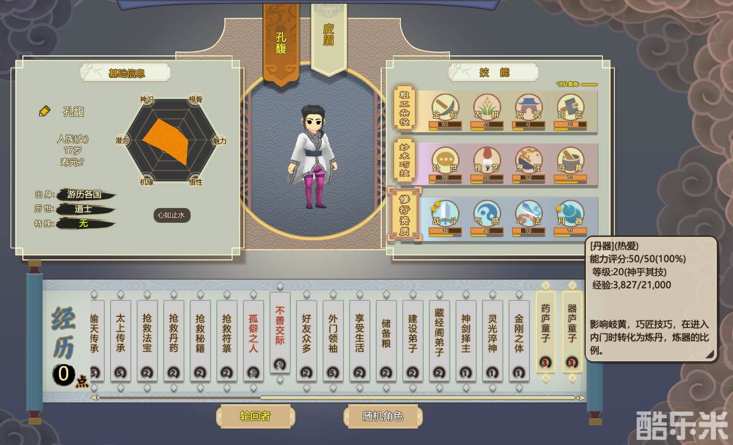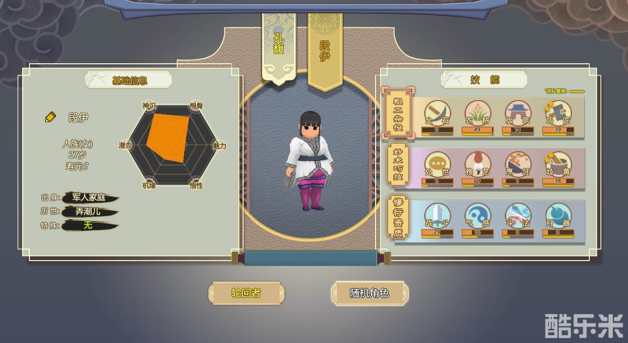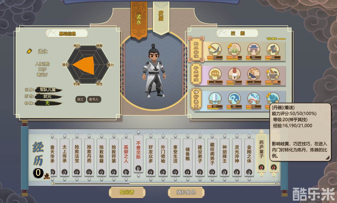 很明显,该功法需求高根骨,高悟性,中神识,中机缘。因此,我们在随机第二人的时候,就照着这个目标随机。然后,这是我们随机出来的人物