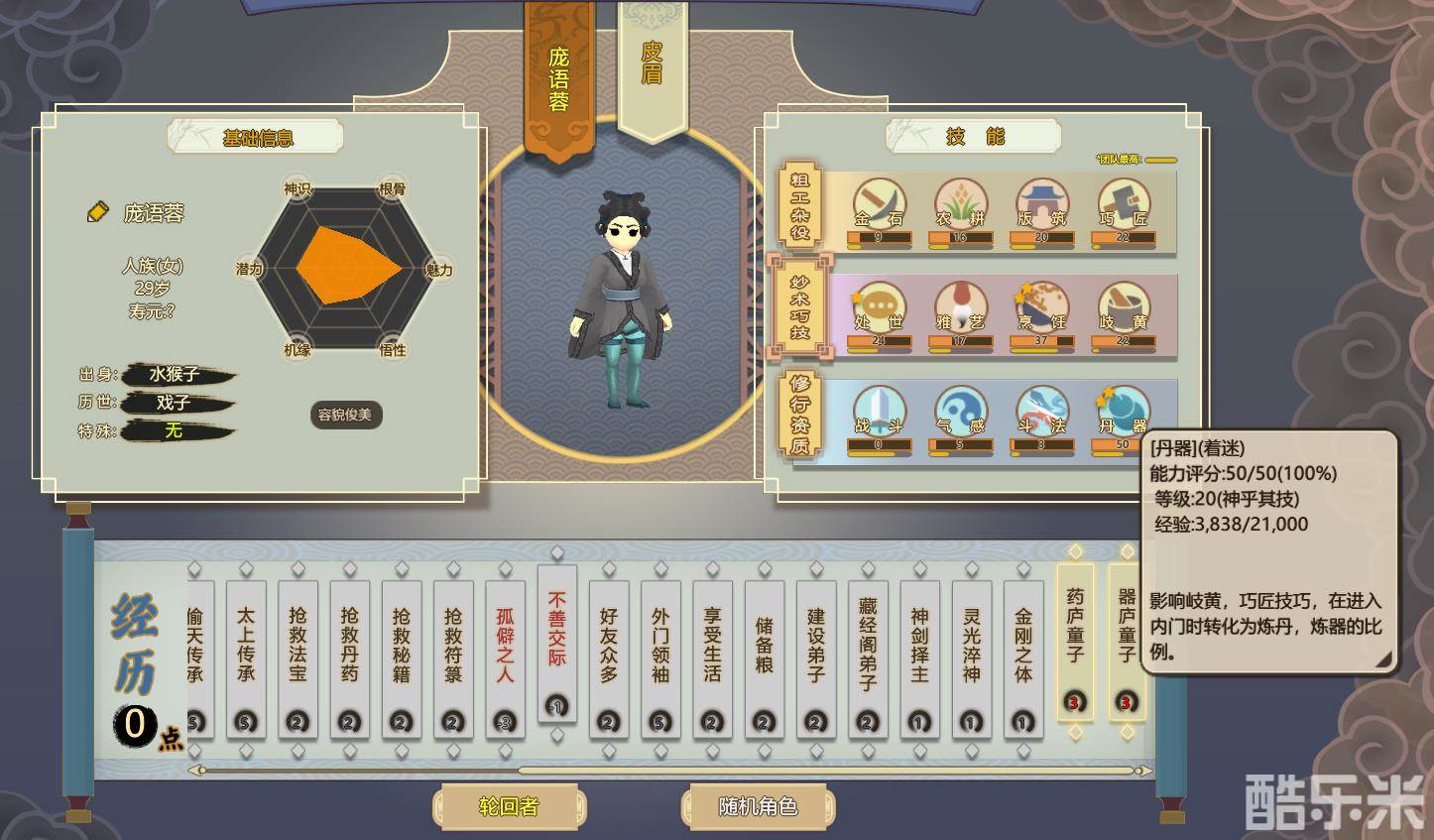 照例,因为是轮着随机的,所以我们只能采用第三人开局,不过第三人的属性貌似比第一人更加完美,气感和斗法爆棚,难道是天助我也?机缘有所不足,可以用【天机化运大法】弥补,带个冷漠属性也无伤大雅,匹配度应该在100以上,毫无问题。然后开始我们的修仙之旅。