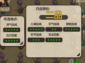 (五)已建造好结丹突破台,并且突破台和天时地利人和属性达到了如下图的程度。(时节+5,天气加成可以不要,有时丹品预估有误,显示2品也可成一品金丹。灵气加成的“+”据实际测试,可以更高加成,但并不显示。)