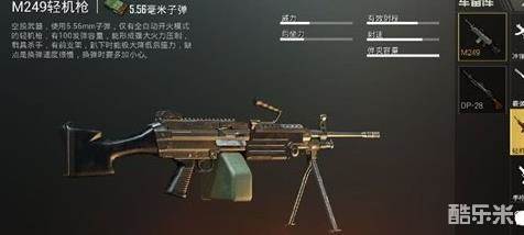 这把枪属于空投武器,使用的是5.56毫米子弹,全自动开火模式,整个游戏中弹夹容量最多的武器,可填装100发子弹,射速极快,威力巨大。适合进行扫射火力压制,对敌人进行突脸,近距离作战,不适宜远距离作战。由于弹夹容量超大,一连串的火力压制对敌方载具是属于毁灭性的杀手武器。因为一般来说,要打爆一辆载具的话需要两梭子弹,一梭子基本在30发-40发子弹之间。而M249强大的弹夹容量完美的弥补了换子弹的间隙缺陷。一梭子扫过去,任何载具都会被打成筛子。建议在全息瞄准镜、红点瞄准镜之间选择,其他的高倍镜不推荐用于M249。