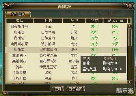 每隔一段时间,不同的港口都会随机产生出“流行”货物,大流行一旦爆发时,货品供不应求,物价暴涨,此时正是商人们热血澎湃的时刻!在流行爆发的时候,玩家只要向指定的港口出售指定的“流行”货物,就能获得双倍的报酬。