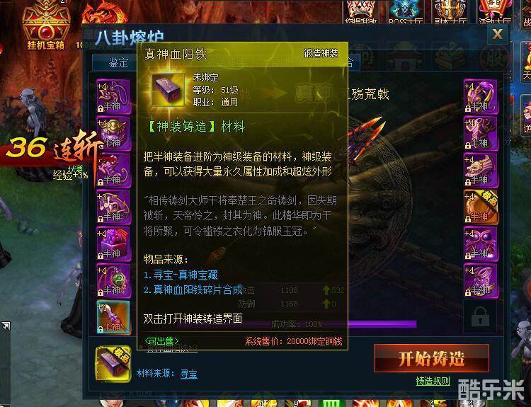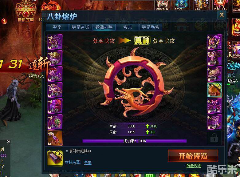第二,神装锻造获得,玩家在熔炉——锻造神装锻造获得,玩家需要消耗真神血阳铁即可将半神装备进阶为真神金色装备。