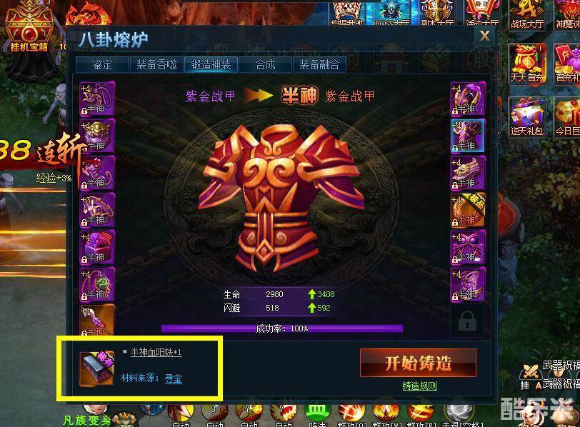 第三,锻造获得,在熔炉——锻造神装处,玩家可以将紫色装备锻造为半神橙装,需要消耗半神血阳铁。