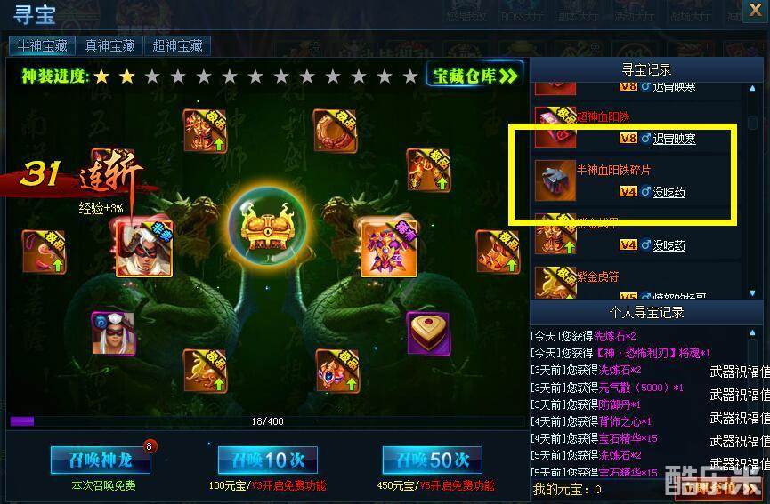 这里又不得不说一下半神血阳铁的获得,阳铁主要通过寻宝、阳铁碎片合成、以及一些运营活动获得。