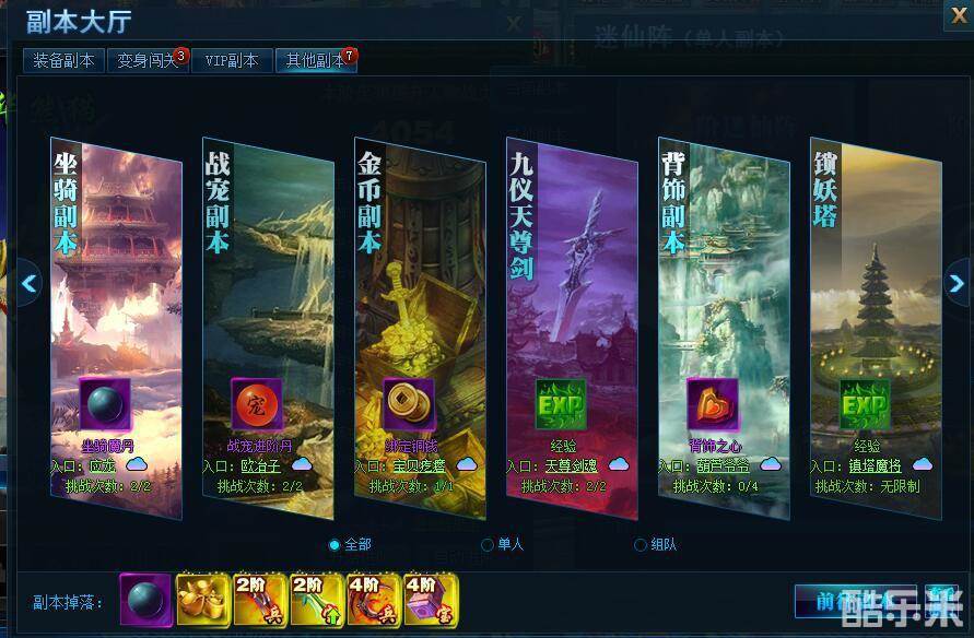 坐骑副本的入口处在应龙,属于单人副本,又叫做迷仙阵副本,除了产出进阶魔丹以外,还产出绑定元宝,魔刀、法宝装备,boss难度越大,奖励越多。