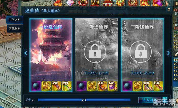玩家选择自己想要打的副本,点击进入即可,进去以后,迷仙阵是分层的,打完一层自动进入下一层,击杀boss以后,掉落大量奖励,有坐骑魔丹、绑定元宝、体力丹等等。