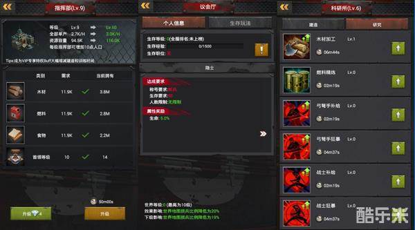 指挥部:在这里可以查看整座城市的发展状态,虽然不直接参与资源生产、军队培养等事项,但其他所有的建筑升级都依赖于指挥部。指挥部的等级高低,直接关系着可解锁的建筑物数量。