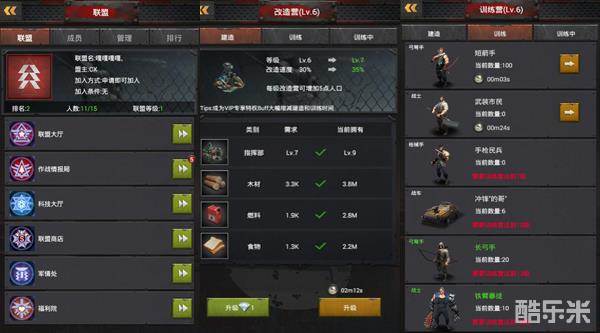 联盟:加入联盟后,可与其他幸存者一同抵抗僵尸的入侵和敌人的讨伐。此外,联盟科技还能为你提供大量的战力和奖励,而联盟商店中亦可购买到各种生存必需品。
