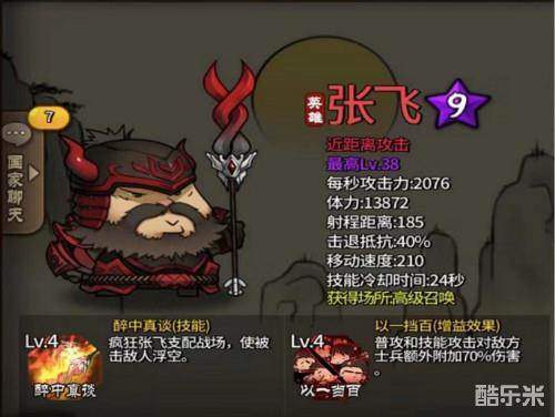 英雄张飞擅长近距离攻击,从武将个项数值看体力较强,适合置于前位,用于抵抗攻击,儿武将技能【醉中真谈】疯狂的张飞支配战场,使被击敌人浮空。该技能主要用于在战斗过程中给我方士兵和武将取得缓冲时间。英雄张飞的增益效果【以一挡百】为普攻和攻击技能对敌方士兵额外增加70%伤害。当英雄张飞的【以一挡百】增益效果被触发在原有的伤害上增加70%。强势的体力和攻击力的组合,英雄张飞适合在队伍中担任前锋的角色。