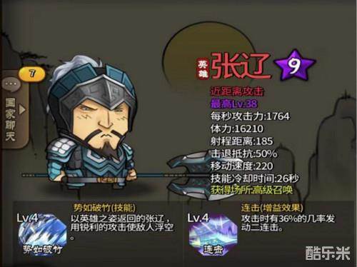 英雄张辽相对于【1~4星】的武将张辽,进步可不是一点点,那么英雄张辽在那些方面有所提升又改怎么使用呢?与英雄张飞一样,英雄张辽适合近距离攻击,近距离攻击类武将的几个重要因素是,体力与攻击力,强化后的英雄张辽,每秒攻击力1764,体力为16210,击退抵抗50%,同样适合在战斗中适合做前锋,技能【势如破竹】以英雄之姿返回的张辽,用锐利的攻击使敌人浮空。【连击】的增益效果在攻击时有36%的几率发动二连击。在武将技能方面,英雄张辽的优势并不明显。所以在前位武将的选择上英雄张辽的优势显得弱势一些。