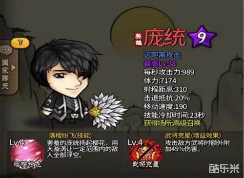 英雄庞统的官方定位是擅长远距离攻击,远距离攻击的武将主要体现在射程距离和移动速度,我们可以了解到庞统体力为7174,射程距离为310,移动速度为190,技能冷却时间为23秒。技能【落樱纷飞】害羞的庞统扬起樱花,用大漩涡让一定范围内的敌人全部悬空。增益效果【武将克星】攻击敌方武将时额外附加45%伤害。这其中,增益效果可以附带45%的伤害给予敌方武将,同时加上我军士兵的围攻,攻击敌方武将可以说是事半功倍。