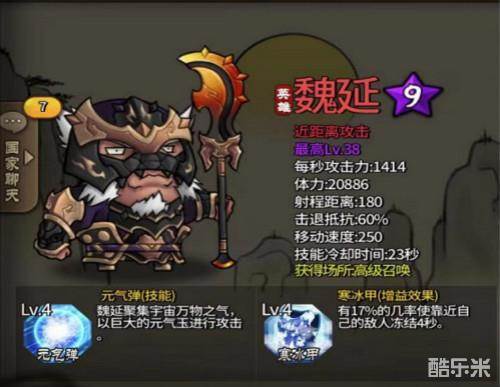 英雄魏延同样作为【6~9星】武将中近战攻击的翘楚,从武将数值上可以看到,每秒攻击力1414,体力20886,射程180,英雄魏延作为近战武将的主要优势体现在体力方面,该武将置于前位,主要用途为抵抗敌方进攻,加上本身的攻击力也足够,选择英雄魏延也是一个不错的选择。英雄魏延的【元气弹】技能,魏延聚集宇宙万物之气,以巨大的元气玉进行攻击。增益效果【寒冰甲】有17%的几率使靠近自己的敌人冻结4秒。