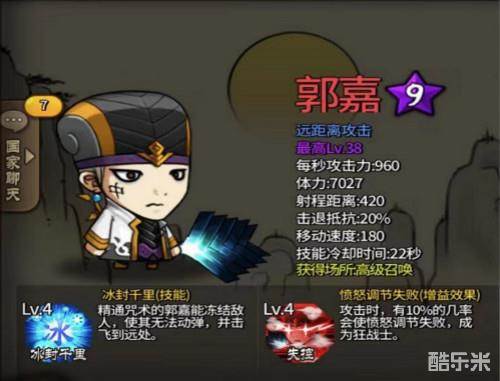 擅长远距离攻击,每秒攻击力960,体力7027,射程距离420,移动速度190,技能【冰封千里】精通咒术的郭嘉能冻结敌人,是其无法动弹,并击飞到远处,首先这个技能可以使敌方保持数秒的静止状态,同时并击飞至远处,保证技能释放范围内的敌军在短时间内无法造成伤害。郭嘉如果配备上一个强势攻击的武将作为搭配效果更为显著,增益效果【愤怒调节失败】攻击时,有10%的几率会使愤怒调节失败成为狂战士。