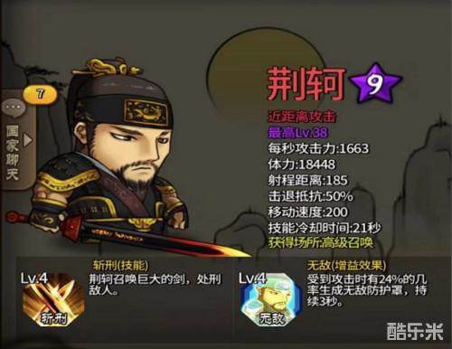 荆轲作为近距离攻击的武将,每秒1663,体力18448,综合实力完胜,【斩刑】技能荆轲召唤巨大的剑,处刑敌人,该技能效果炫酷,,同时荆轲的增益效果【无敌】受到攻击时有24%的几率生成无敌防御罩持续3秒,有攻击,有防御,技能效果炫酷的武将荆轲你值得拥有。荆轲的增益效果也给各位君主多一个选择,放置于中位的荆轲也可以有不错的表现。