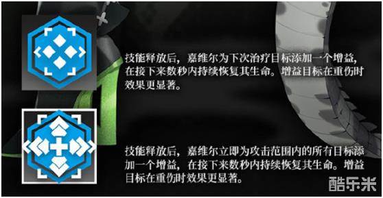 当嘉维尔的技能触发后,她的下一个治疗目标将会在数秒内持续恢复生命值,且当目标处于重伤状态时,该增益效果将更加显著。如若嘉维尔精英化,他还会得到一个强化版的一技能:为范围内所有的目标均增加一个持续性的回复增益,同样对重装目标具有更显著的疗效。