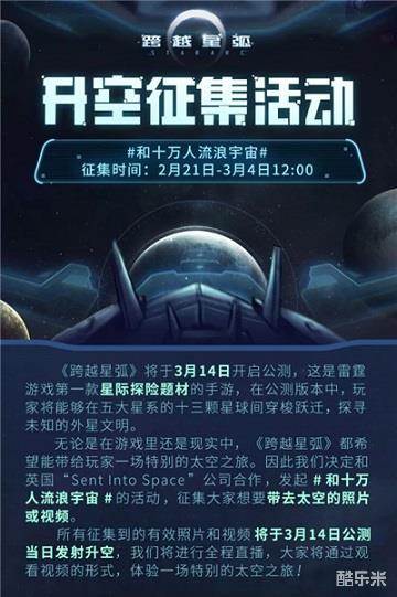 在3月4日前,参加官方活动“和十万人流浪宇宙”,将最喜欢的东西以照片或小视频的形式记录下来,投稿至官方,在公测当天将从全部参与活动的玩家中抽取三名幸运玩家,送出手枪、步枪、重火器、霰弹枪、狙击枪、近战武器,六种橙色武器各一把!