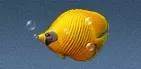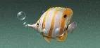 外观:白色的身体带有橘黄色垂直条纹带黑边,在背鳍上有一眼点用于迷惑敌人